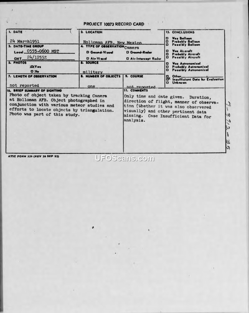 PROJECT 10073 RECORD CARD — Holloman AFB, 24 March 1951