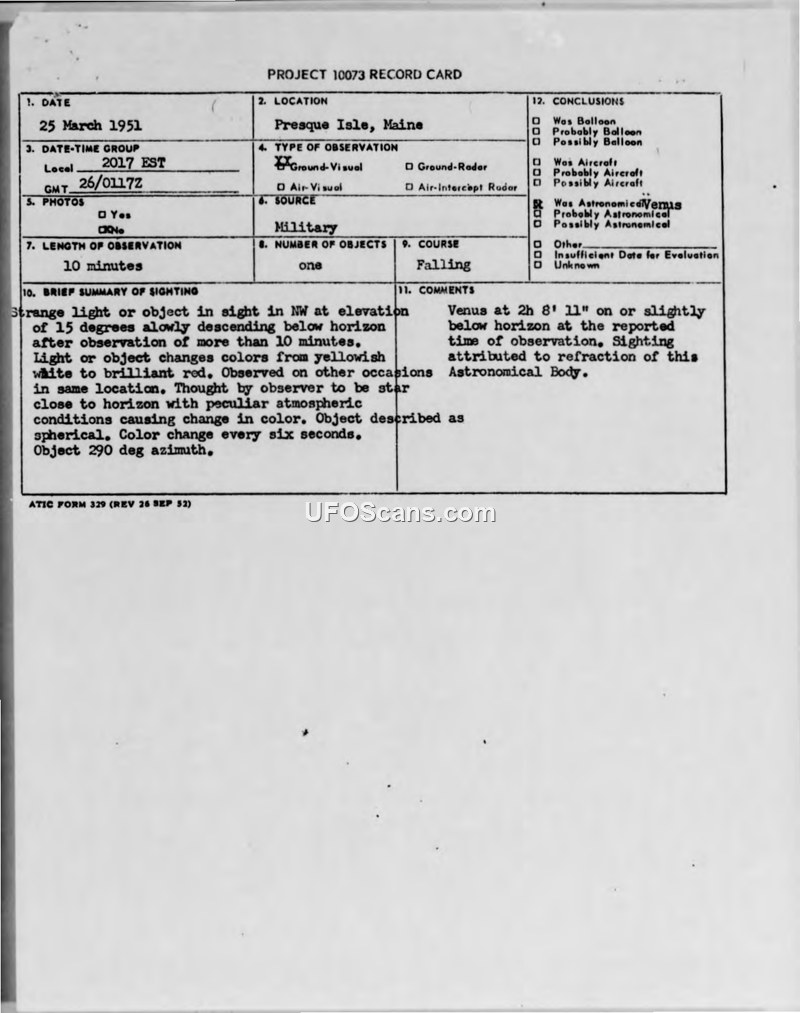 This document details multiple UFO sightings in March 1951, including a primary report from Presque Isle AFB that was officially identified as the planet Venus. It also contains reports from Holloman AFB and other locations, reflecting the Air Force's efforts to document and evaluate aerial phenomena during this period.