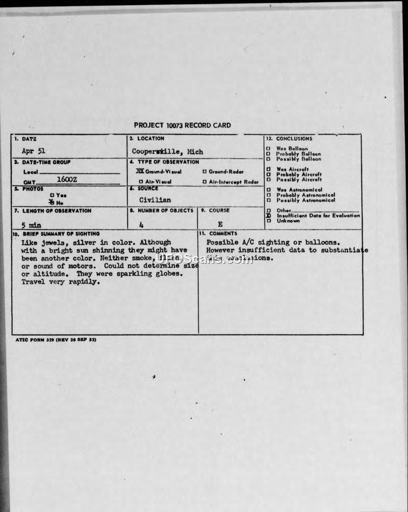 A civilian report from April 1951 describes four silver, sparkling globes observed near Coopersville, Michigan. ATIC concluded there was insufficient data to identify the objects as aircraft or balloons.