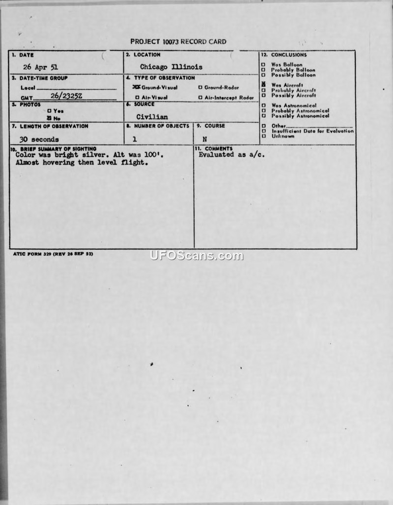 Project 10073 Record Card — Chicago, Illinois, 26 April 1951
