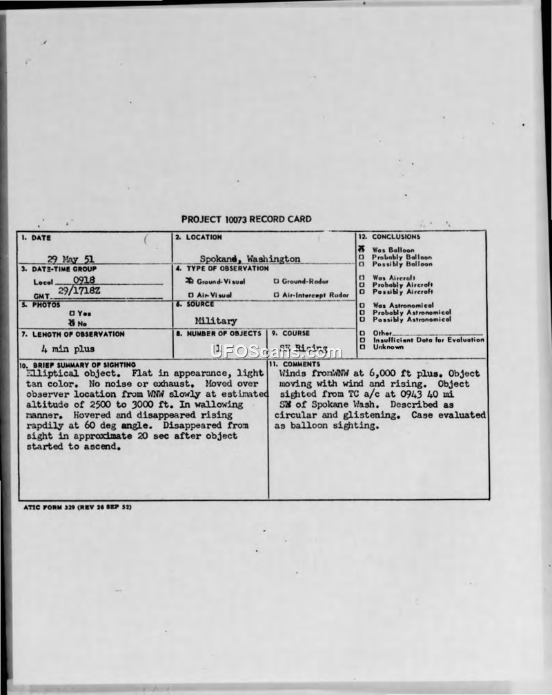 A report from the 116th Fighter-Interceptor Squadron regarding an elliptical, non-powered object sighted over Geiger Field on 29 May 1951. Despite witness descriptions of a 'wallowing' movement and rapid ascent, the official project evaluation categorized the event as a balloon sighting.