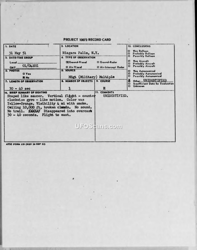 Reporting of Information of Unconventional Aircraft Sighting — Niagara Falls, New York, 1 June 1951