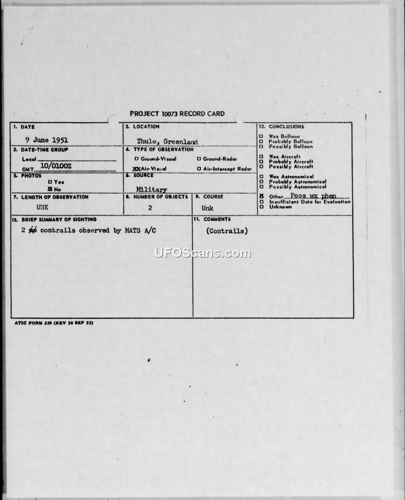 Intelligence Spot Report (Unclassified) — 9 June 1951 Sighting, Thule, Greenland