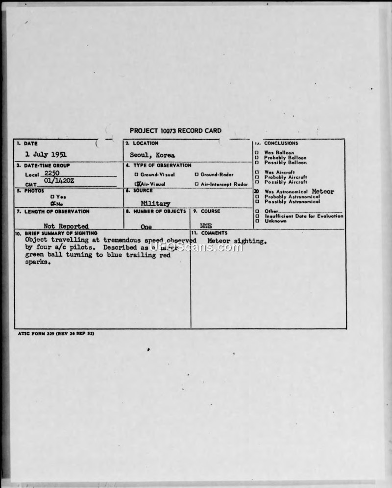 Four night pilots reported a bright green object moving at high speed over North Korea on 1 July 1951. The incident was officially classified as a meteor sighting by the ATIL Office.