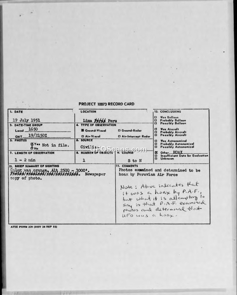 An alleged UFO sighting in Peru in 1951 was investigated by the Peruvian Air Force and officially determined to be a hoax created for commercial gain. The report includes details of the sighting, the subsequent media coverage, and the official debunking by military intelligence.