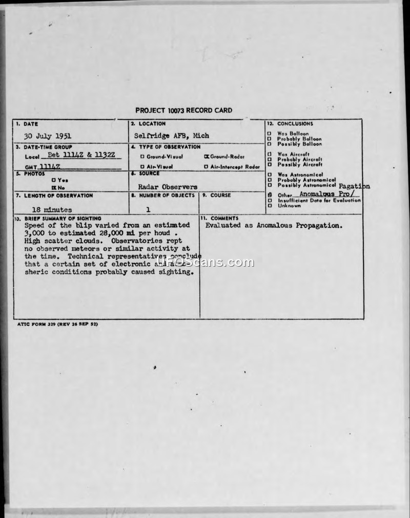A radar sighting of an unidentified object on 30 July 1951 was officially attributed to anomalous propagation and electronic interference between two radar stations. The report highlights that the extreme speeds recorded were inconsistent with physical flight.
