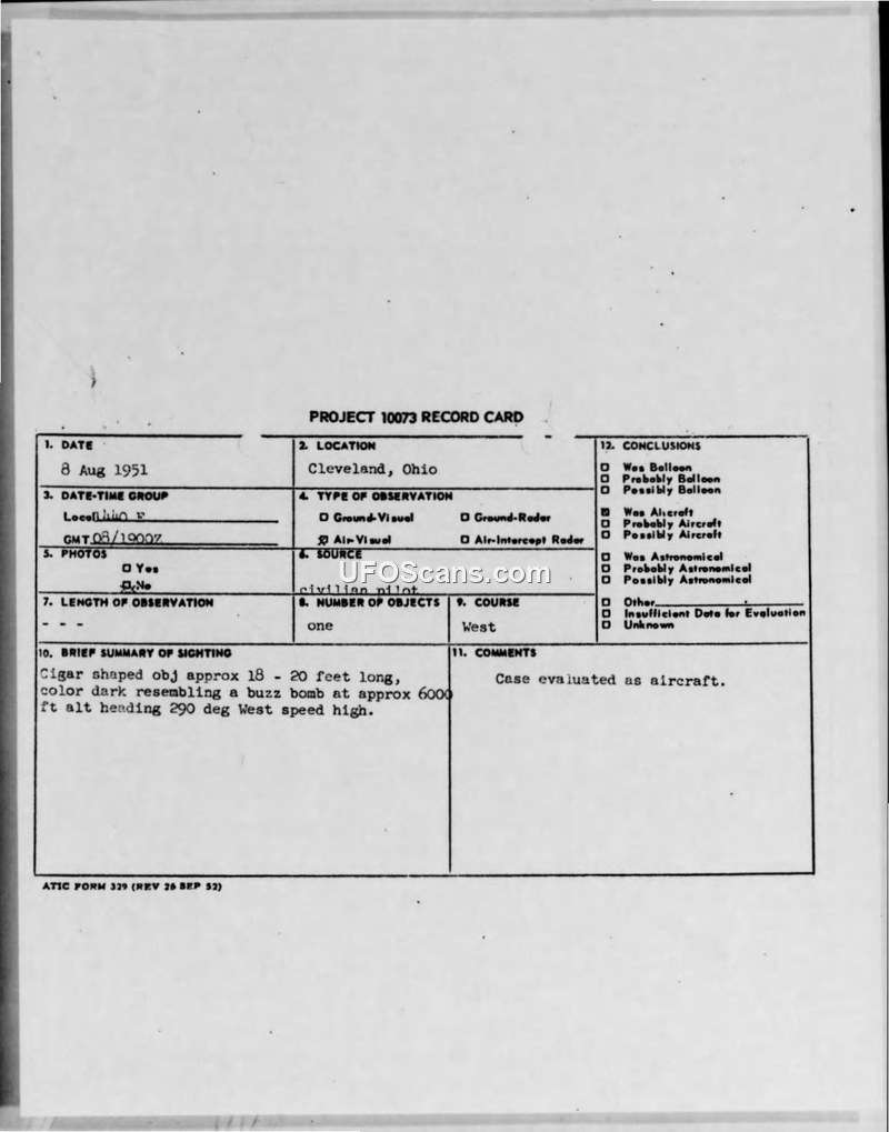 A civilian pilot reported a cigar-shaped object resembling a buzz bomb near Cleveland, Ohio, on 8 August 1951. The Air Force officially evaluated the sighting as an aircraft.