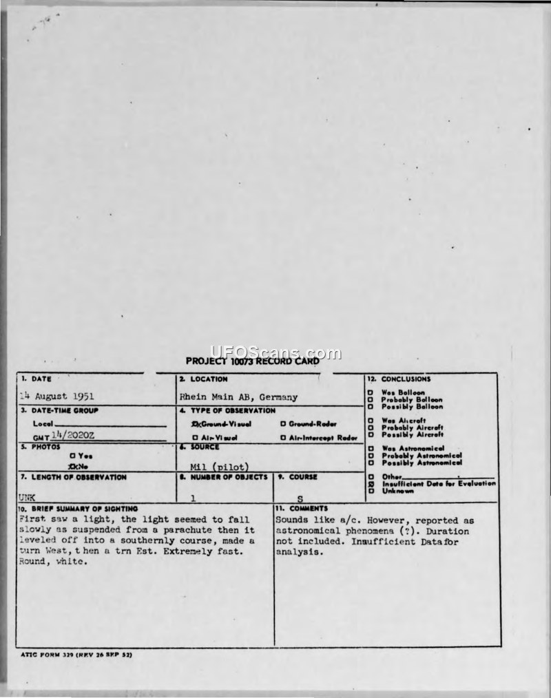 Project 10073 Record Card — Rhein Main AB, Germany, 14 August 1951