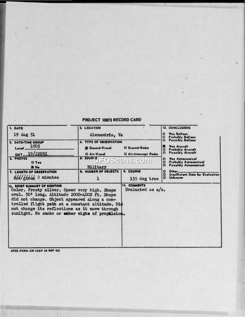 Project 10073 Record Card: Sighting near Alexandria, Virginia, 19 August 1951