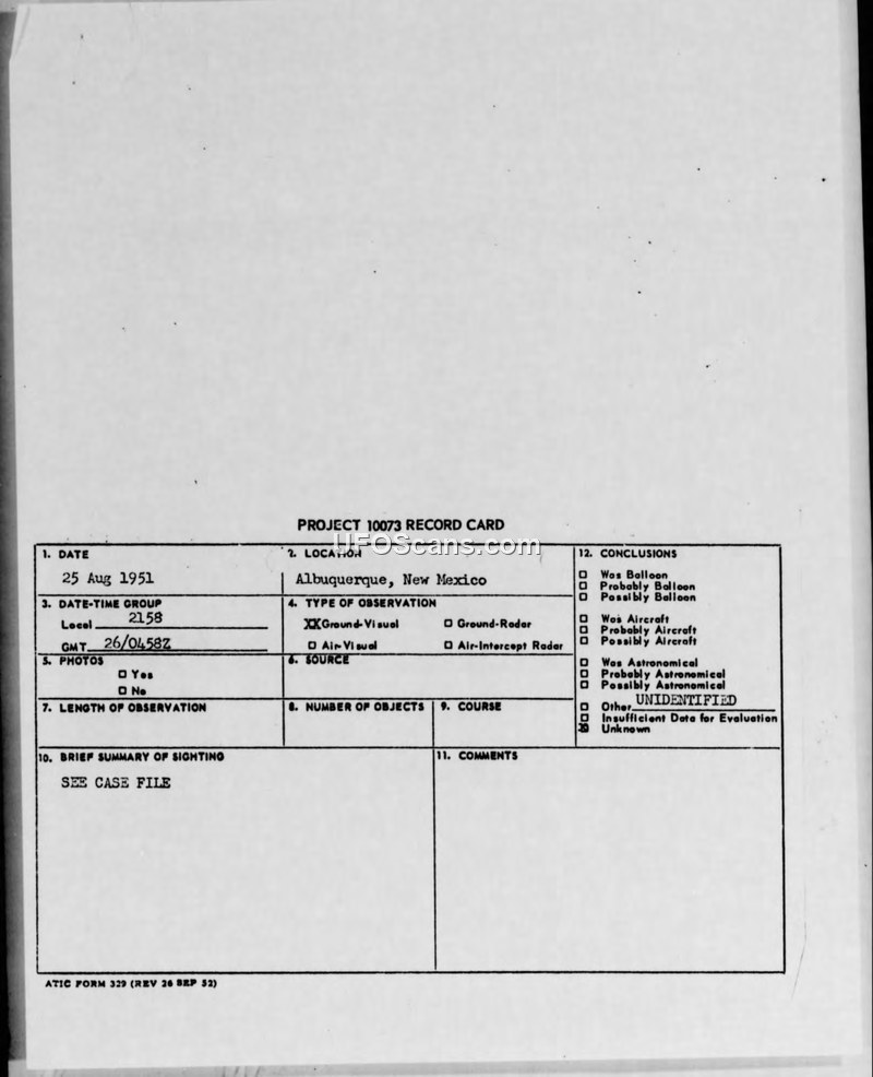 Project 10073 Record Card and Related Correspondence — Albuquerque, New Mexico, 25 August 1951