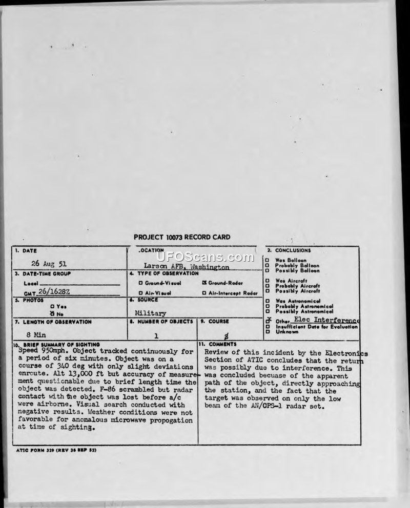 Project 10073 Record Card — Larson AFB, Washington — 26 August 1951