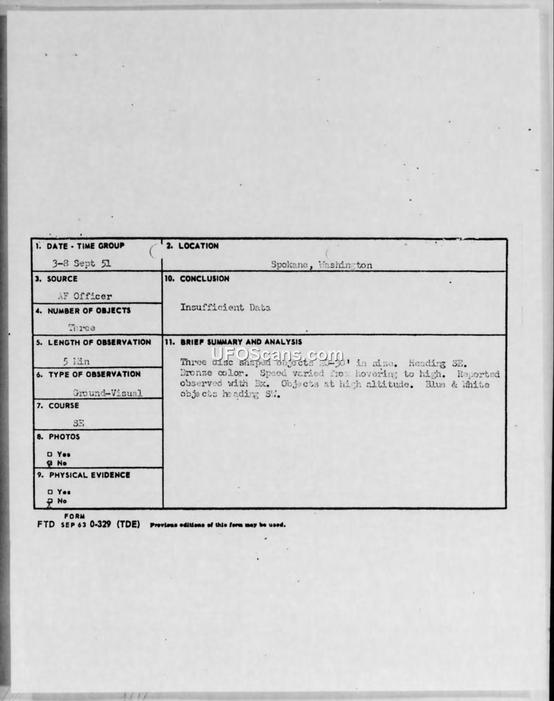 The reports describe multiple sightings of disc-shaped objects and bluish-white lights with fiery trails over Spokane, Washington, in early September 1951. The sightings were reported by Air Force personnel. The official evaluation for the primary disc-shaped object sighting was 'Insufficient Data', while the light-based sightings were tentatively attributed to meteors or fireballs.