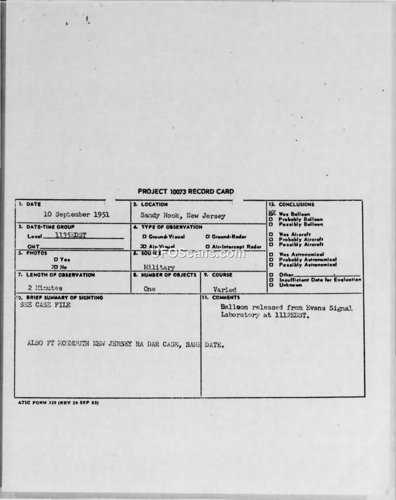 Project 10073 Record Card and Related Investigation Reports — Sandy Hook, New Jersey, 10 September 1951