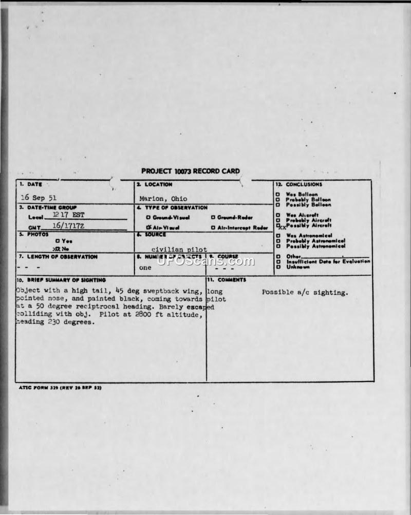 A civilian pilot reported a near-collision with a black, swept-wing aircraft near Marion, Ohio, on September 16, 1951. The incident was investigated by the OSI and forwarded to the Air Technical Intelligence Center, where it was classified as a probable conventional aircraft.