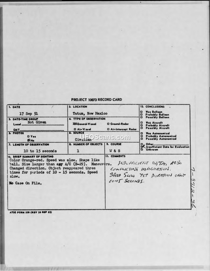This document is a Project 10073 record card documenting an unidentified aerial phenomenon sighting that occurred on September 17, 1951, in Tatum, New Mexico. The report describes a single object, characterized as an orange-red ball, which was observed to be larger than a B-29 aircraft. The witness reported that the object moved at a slow speed, performed maneuvers, and changed direction. Notably, the object was said to have reappeared three times, with each observation lasting between 10 and 15 seconds. The flight path was noted as West and South. The record indicates that no photographs were taken and there was no radar contact. The official conclusion reached by the evaluating agency, ATIC, was that there was insufficient data to perform a proper evaluation. Handwritten comments on the card highlight the conflicting nature of the information provided, specifically noting the contradiction between the reported slow speed and the short duration of the sighting.