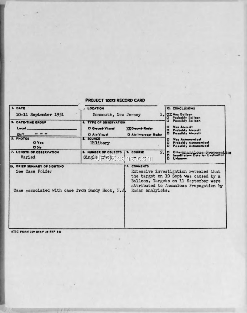 Most sightings attributed to weather balloons or anomalous propagation.