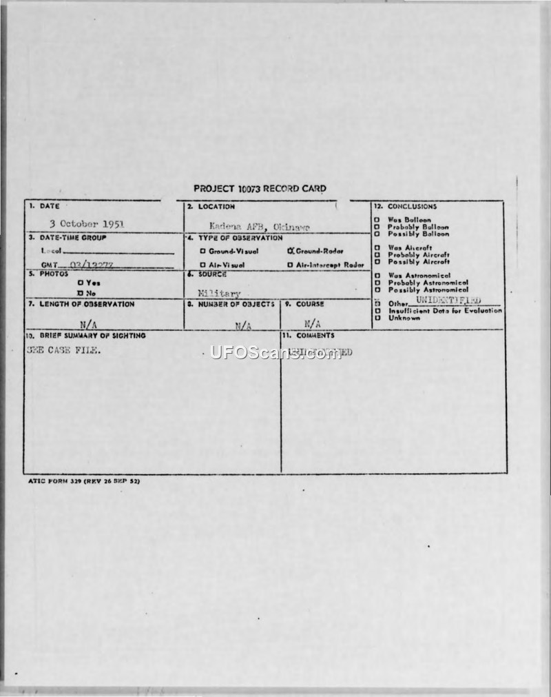 Request for Analysis of Electronic Sighting - Kadena AFB, Okinawa, 3 October 1951