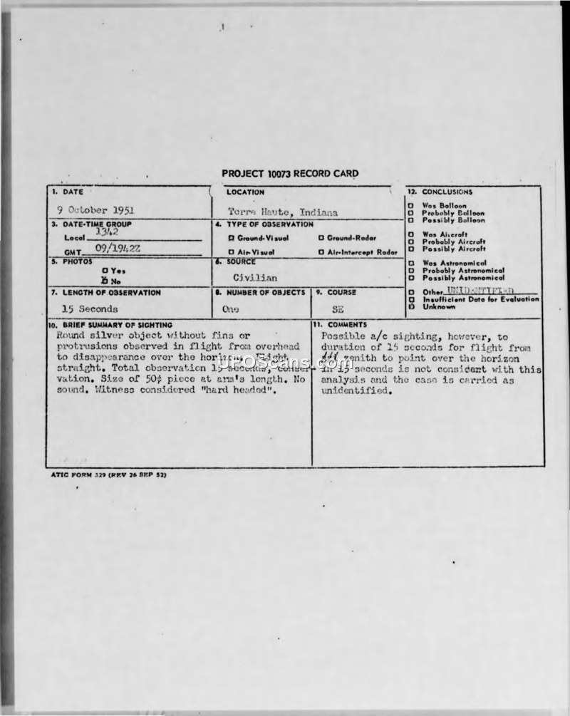 Project 10073 Record Card and Spot Intelligence Report — Terre Haute, Indiana, 9 October 1951
