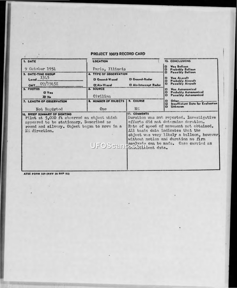 Project 10073 Record Card and Air Intelligence Information Report — Paris, Illinois, 9 October 1951