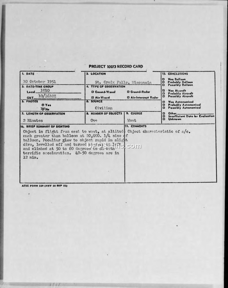 Project 10073 Record Card — St. Croix Falls, Wisconsin, 10 October 1951