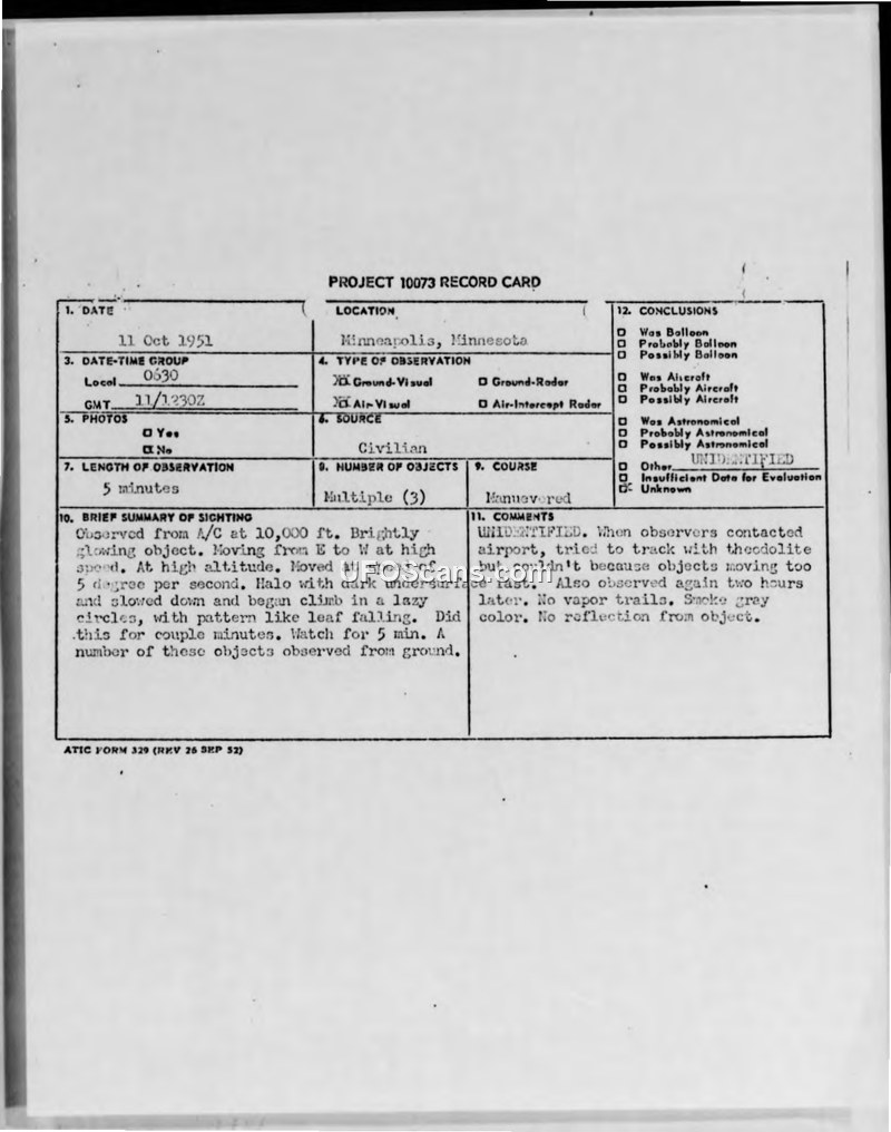 Project 10073 Record Card and Air Intelligence Information Report — Minneapolis, Minnesota, 11 October 1951