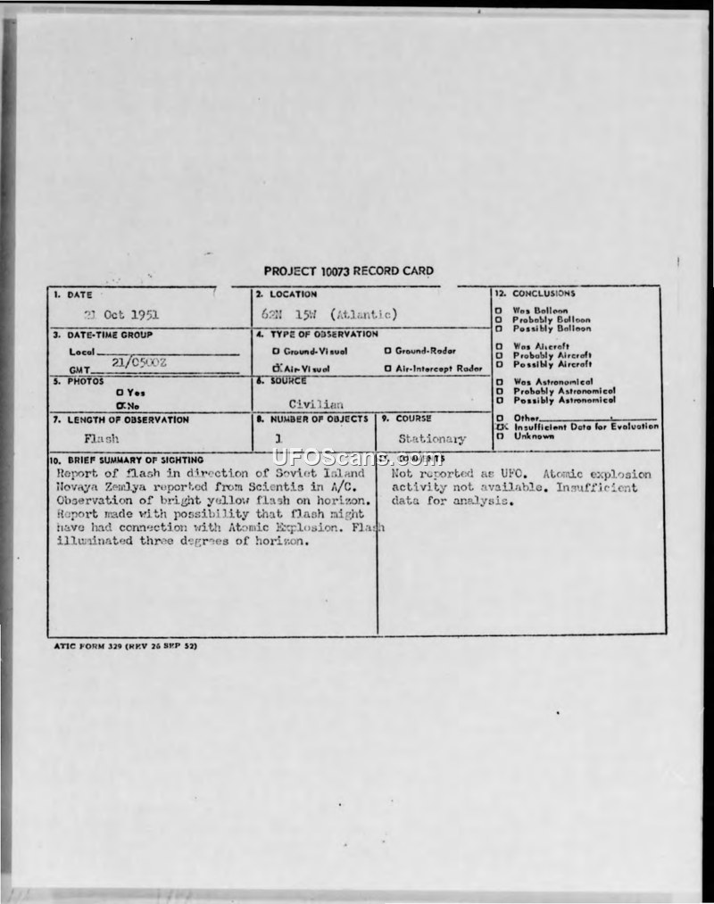 This document is a Project 10073 record card documenting an observation made on October 21, 1951, at 21/0500Z. The location of the observation was recorded as 62N 15W in the Atlantic. The report describes a single, stationary object that manifested as a bright yellow flash on the horizon. The witness, identified as a scientist aboard an aircraft, reported the flash in the direction of the Soviet island of Novaya Zemlya. The flash was described as having illuminated three degrees of the horizon. The report explicitly mentions the possibility that the flash was connected to an atomic explosion. However, the final conclusion reached by the evaluating agency, ATIC, was that there was insufficient data for evaluation. The document notes that the event was not reported as a UFO and that data regarding atomic explosion activity was not available to confirm or deny a connection to such an event.