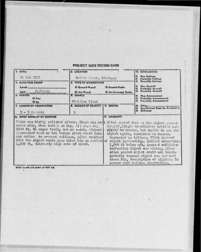 Project 10073 Record Card and Air Intelligence Information Report — Battle Creek, Michigan, 21 October 1951