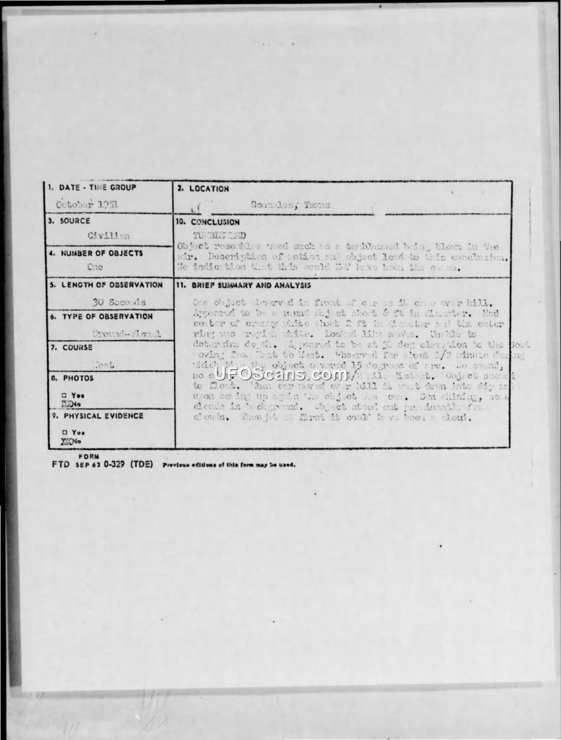 The investigation was initiated following reports of an unusual aerial phenomenon near Gonzales, Texas. Witnesses described a round, white object that appeared to float. While some witnesses were considered reliable, others were noted as potentially prone to exaggeration or seeking publicity. The official conclusion suggests the object was a tumbleweed.