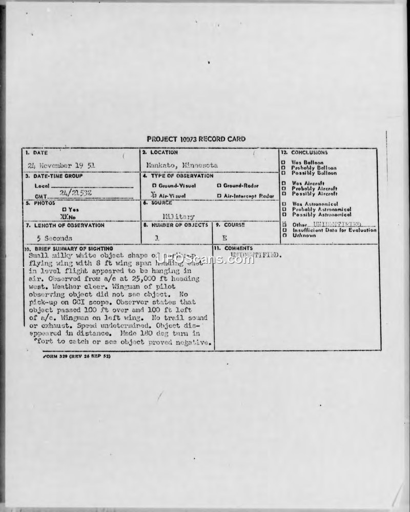 Project 10073 Record Card: Sighting of Unconventional Aircraft, 24 November 1951