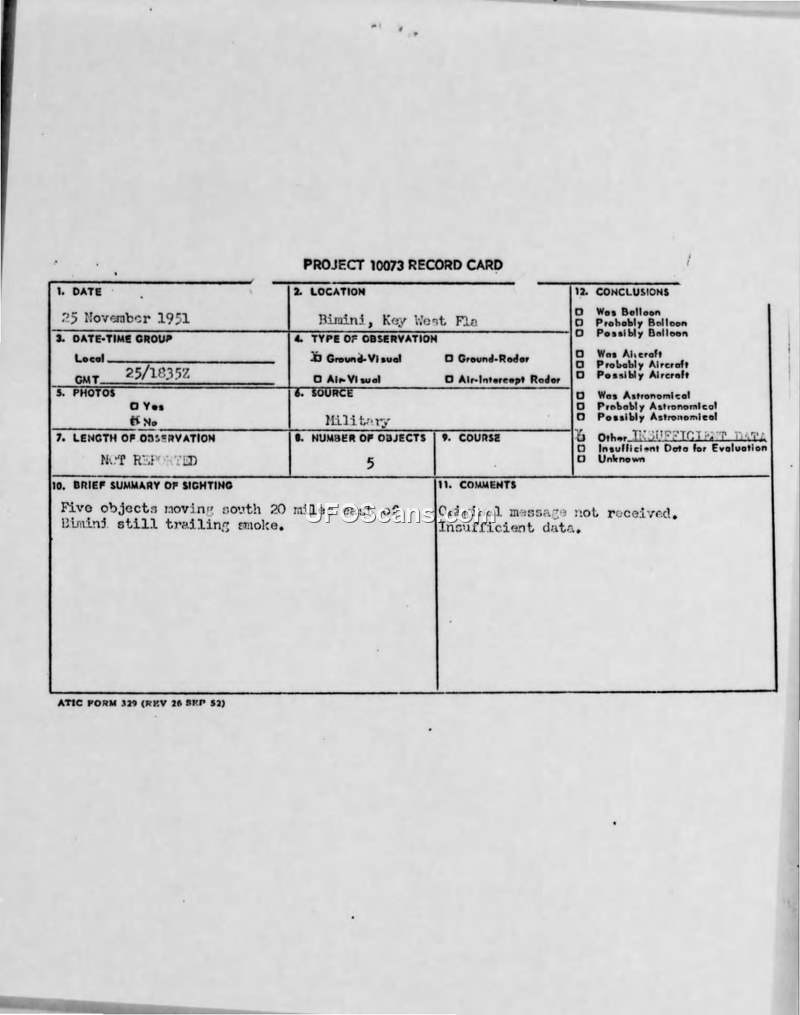 A 1951 sighting report of five smoke-trailing objects near Bimini, Florida, which was filed under Project 10073. The investigation concluded that there was insufficient data to determine the nature of the objects.