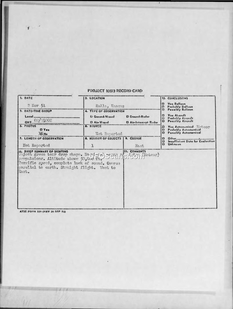 Project 10073 Record Card — Rolla, Kansas, 2 Nov 51