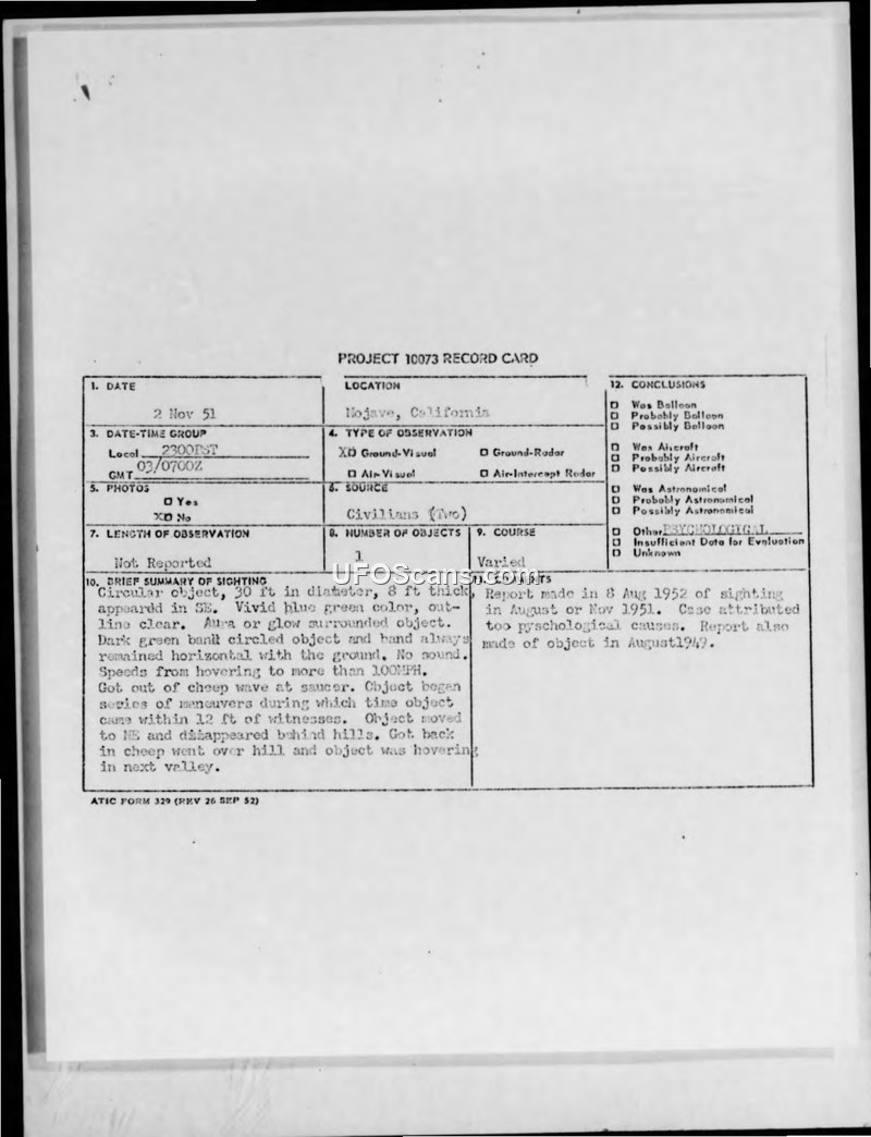 A 1951 sighting of a circular, glowing object by two U.S. Forestry Service employees in California was officially attributed to psychological causes. The witnesses were considered credible, though the report notes one was a historical novelist.