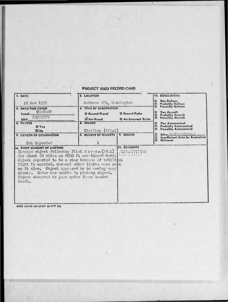 Project 10073 Record Card — Sighting of Strange Object, 18 November 1951
