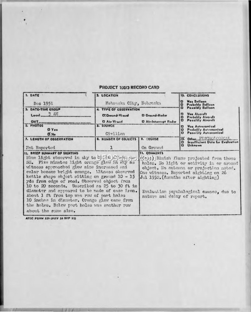 This document consists of a Project 10073 record card and a supporting Spot Intelligence Report dated July 29, 1952, regarding a sighting that occurred in December 1951 near Peru, Nebraska. A civilian witness reported observing a blue light in the sky while driving on Highway 73. He described the object as a kettle-shaped craft, approximately 25 to 30 feet in diameter, appearing to be constructed of cast iron. The witness claimed the object was sitting on the ground 10 to 15 yards from the road and featured a row of 10-inch diameter port holes from which a blue-ish flame was projected. The witness observed the object for 10 to 20 seconds before it changed color to a bright orange. The witness did not report the incident immediately, waiting until July 1952 to contact the FBI, citing a fear of being treated lightly and the prevailing 'flying saucer scare' in the country at the time. The 13th District Office of Special Investigations (OSI) at Offutt Air Force Base investigated the report and concluded that the sighting was likely attributable to psychological causes, noting the significant delay in reporting and the nature of the account. The document is marked as unclassified and includes instructions for downgrading and declassification.
