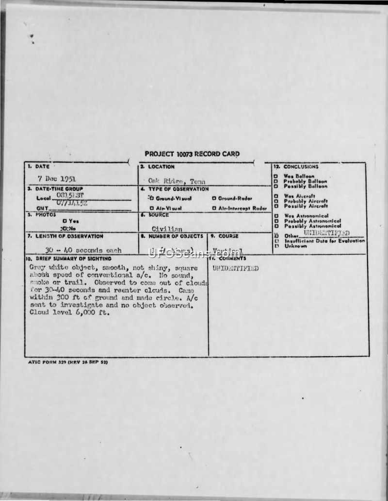 Air Intelligence Information Report: Unidentified Aerial Object, Oakridge, Tennessee, 7 December 1951