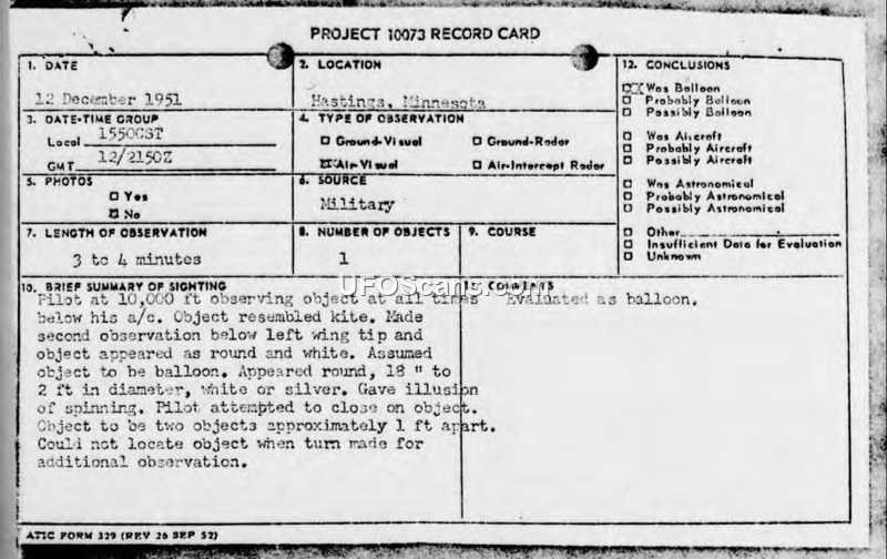 Project 10073 Record Card — Sighting of Unidentified Object, Hastings, Minnesota, 12 December 1951
