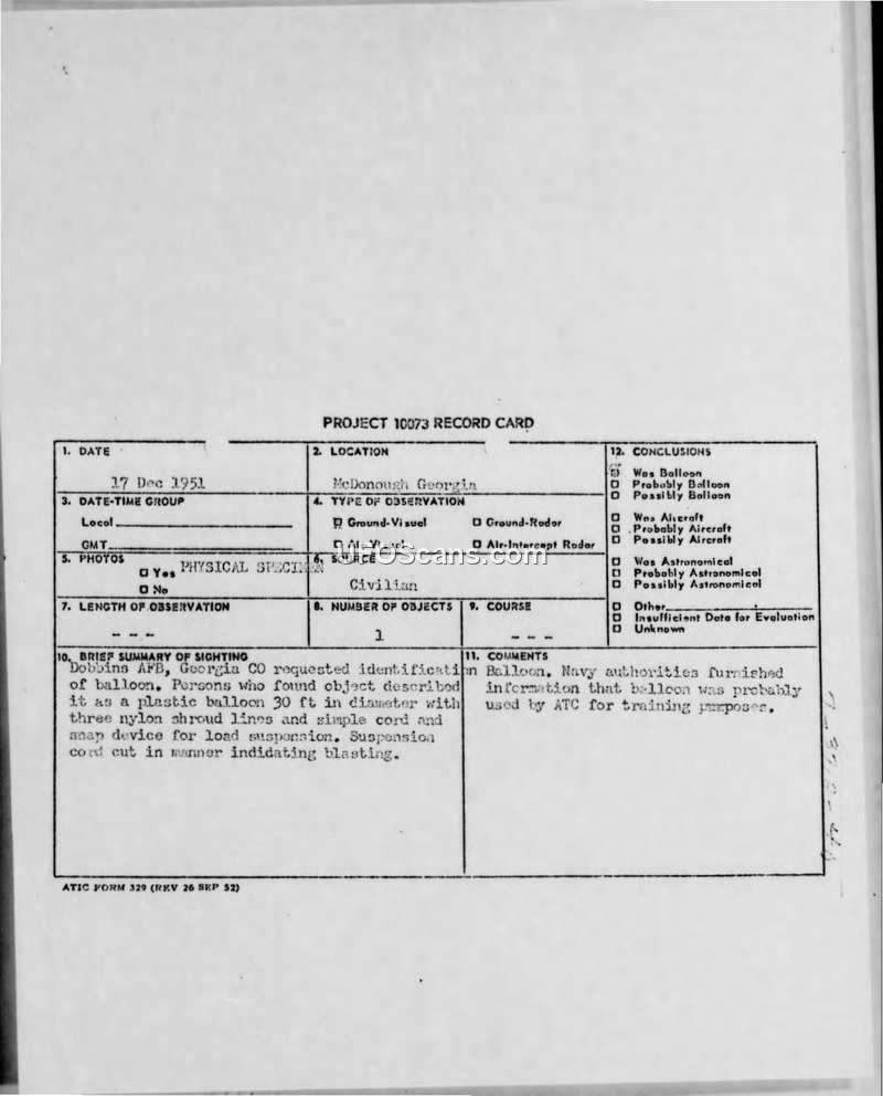Project 10073 Record Card — McDonough, Georgia, 17 December 1951