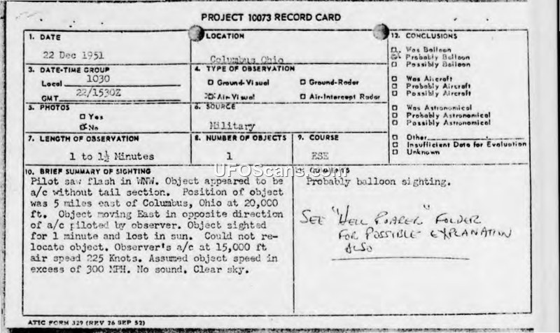 A veteran jet pilot reported an unidentified silver object rolling in the sky near Columbus, Ohio, on 22 December 1951. Official investigators concluded the object was likely a weather balloon, despite the pilot's description of maneuvers inconsistent with balloon flight.