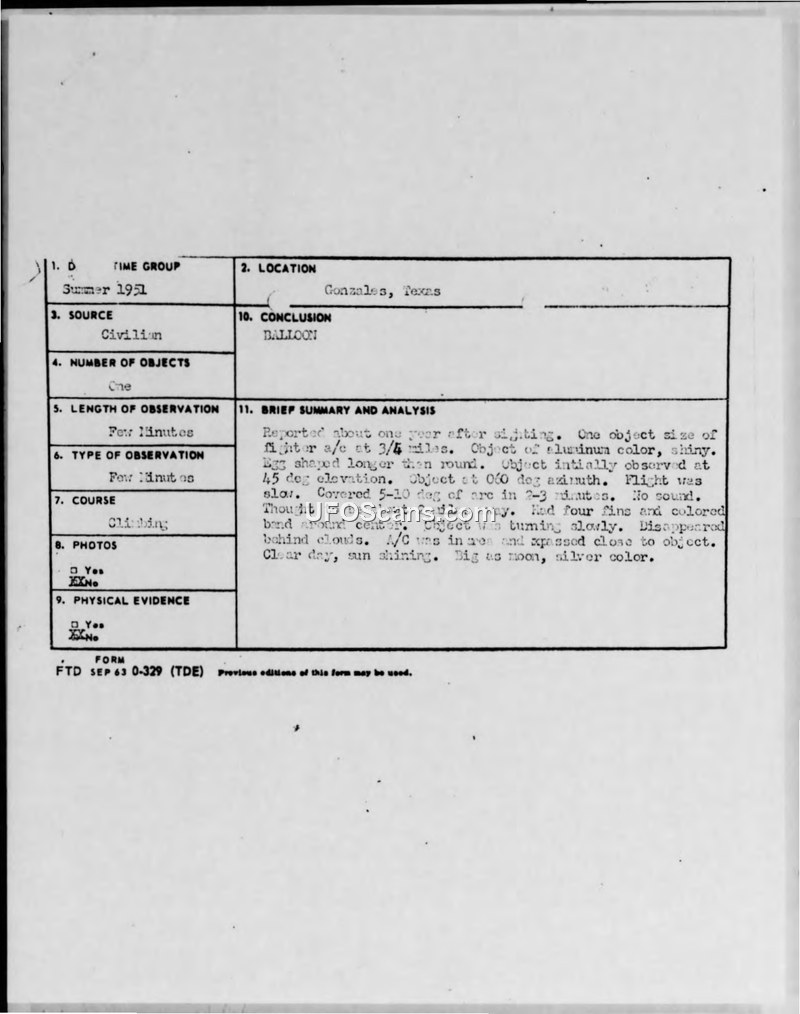 This OSI report investigates 1951 aerial sightings in Gonzales, Texas, concluding they were likely balloons. It also includes a separate, unexplained sighting report from the Corona Experimental Radar Site in New Mexico.