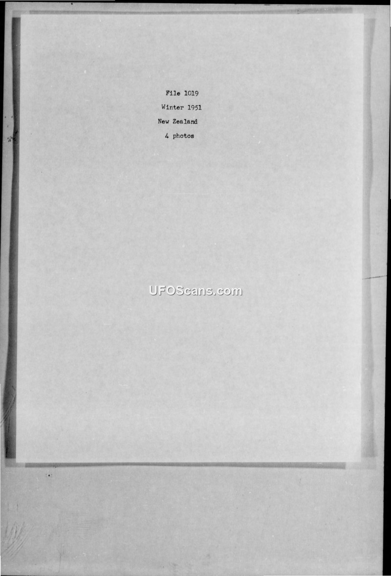 File 1019 contains four photographs of an unidentified aerial object sighted in New Zealand during the winter of 1951. The images show a disc-shaped object hovering above a treeline.