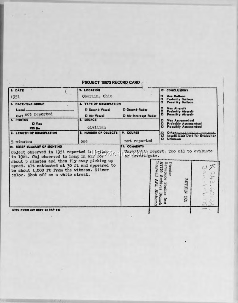 A 1964 report of a 1951 UFO sighting in Oberlin, Ohio, was deemed unreliable by the Air Force due to the significant time delay. The Air Force concluded that the case lacked sufficient data for a formal evaluation.
