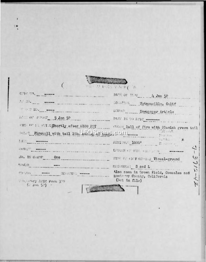 Project Blue Book Sighting Report — Watsonville, California, January 5, 1952