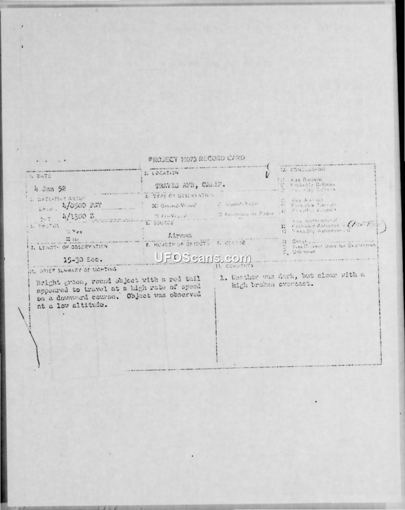 Pfc. Clifford W. Smith reported a bright green, tear-drop shaped object with a red tail descending at low altitude over Travis AFB on 4 January 1952. The report was officially classified as resembling a large meteor.