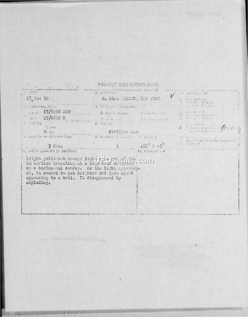 Civilian Charles Karlik reported a high-speed, orange-yellow aerial object that veered and exploded over Long Island on 17 January 1952. The Air Force collected his detailed sketches and theories, forwarding them to the Air Technical Intelligence Center for analysis.
