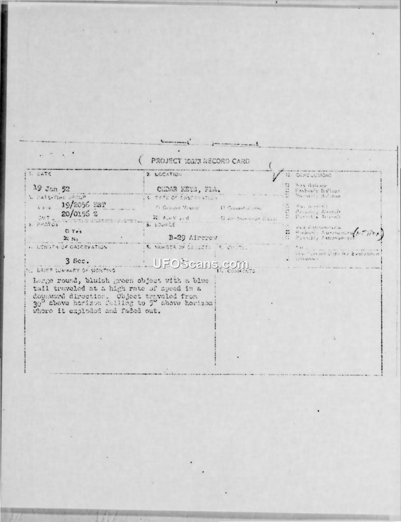 This document contains a series of reports and internal correspondence regarding a sighting of an unidentified aerial phenomenon on January 19, 1952, near the Cedar Keys Bombing Range in Florida. A B-29 crew from the 32nd Bomb Squadron observed a large, round, bluish-green object with a 150-foot blue tail traveling at high speed. The object was seen descending from 30 degrees above the horizon to 5 degrees above the horizon, where it appeared to explode and fade out. The crew, including the aircraft commander and a 1st Lieutenant, reported the incident as a fireball-type phenomenon. The document notes that the crew members were considered truthful and cooperative. Further investigation by the Office of Special Investigations (OSI) and the Air Technical Intelligence Center (ATIC) concluded that the object had no relation to known meteorological or astronomical activity. The report highlights that this incident was consistent with the 'green fireball' class of unidentified objects, a phenomenon that the Air Force Cambridge Research Laboratory had been investigating for two years without reaching definitive conclusions. The document also references a previous, similar sighting reported by a pilot in 1948 during a flight between Denver and Albuquerque. Despite the lack of physical evidence, the Air Force continued to collect data on these occurrences for future reference.
