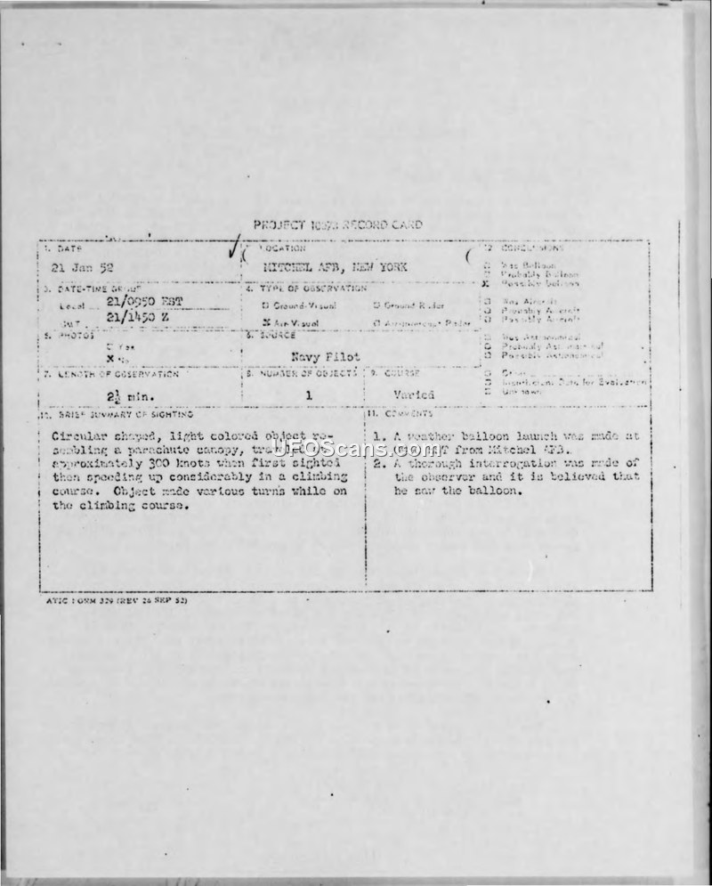 On 21 January 1952, at approximately 0950 EST, a U.S. Navy pilot flying a TBM aircraft near Mitchel AFB, New York, observed an unidentified aerial object. The pilot initially described the object as circular, light-colored, and resembling a parachute canopy, with a dark under-surface and a length-to-depth ratio of approximately 1:3. The object was estimated to be 20 to 30 feet in diameter, traveling at an initial speed of 300 knots at an altitude of 200-300 feet. During the two-and-a-half-minute observation, the pilot attempted to intercept the object, performing a left turn. The object subsequently accelerated to an estimated 500 knots and climbed before disappearing. The pilot reported that the object appeared to oscillate during level flight. An investigation was conducted, including a field trip to Mitchel AFB to re-interview the pilot and personnel from the weather station. It was determined that a Rawinsonde balloon had been launched from the base at 0950 EST. These balloons are typically six feet in diameter, light gray with white streaks of talcum powder, and carry a tin-foil radar reflector. While the weather station personnel could not confirm radar contact with the TBM or the balloon due to heavy air traffic, the report notes that the object's appearance—specifically the segments resembling parachute panels—could be explained by the talcum powder streaks on the balloon. Despite the pilot's certainty that he saw the object while north of the airfield, investigators concluded that while the object could not be definitively identified as the balloon, there was a strong possibility of such an identification. The report highlights discrepancies in the pilot's sketches, particularly regarding the radius of his turns, and suggests that the pilot's high-speed maneuvers and concentration on the object may have led to errors in his estimation of the object's path and behavior. Ultimately, the investigation remained inconclusive, noting that the object's unusual appearance at such a low altitude over a populated area would typically have resulted in more reports from the ground, which were not forthcoming.