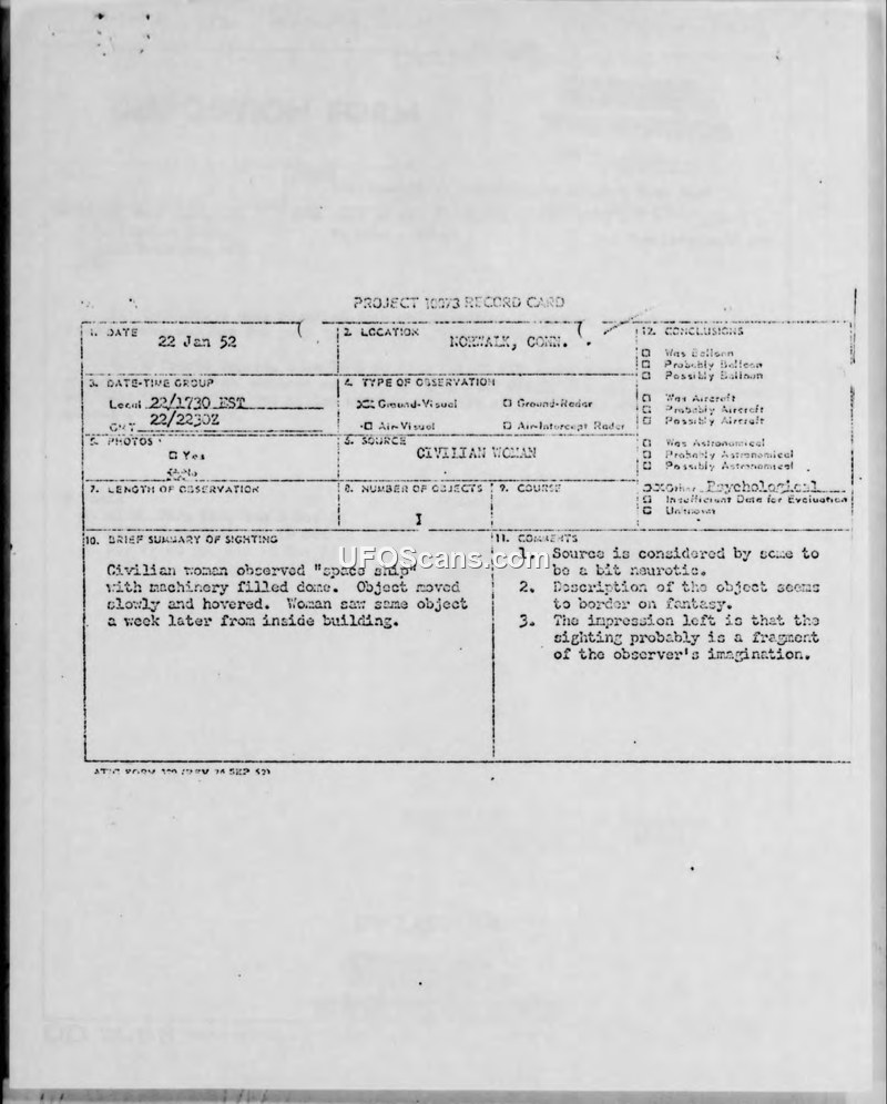 A civilian woman in Norwalk, Connecticut, reported a dome-shaped 'space ship' in January 1952. Air Force investigators concluded the sighting was likely a product of the witness's imagination.