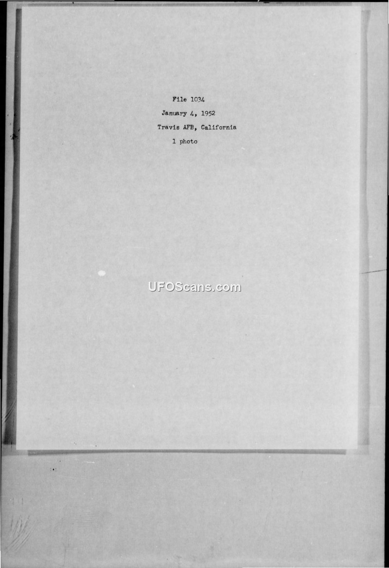 This document, identified as File 1034, pertains to a sighting incident that occurred on January 4, 1952, at Travis Air Force Base in California. The file consists of a brief cover sheet and a single aerial photograph of the base. The photograph is marked with the coordinates 38°16'N 121°56'W and includes annotations identifying the locations of an 'OBJECT' and an 'OBSERVER'. The document is classified as 'RESTRICTED'. No further narrative details regarding the nature of the object, the identity of the observer, or the circumstances of the sighting are provided within the available pages.