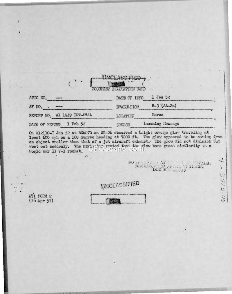 An RB-26 aircraft observed a bright orange, V-1 rocket-like object traveling at 600 mph over Korea on January 1, 1952. The report was evaluated by ATIC.