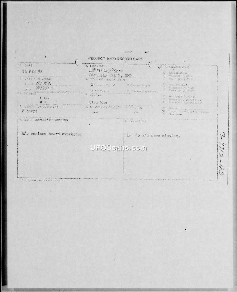 Project 10073 Record Card and March 1952 Sighting Compilation